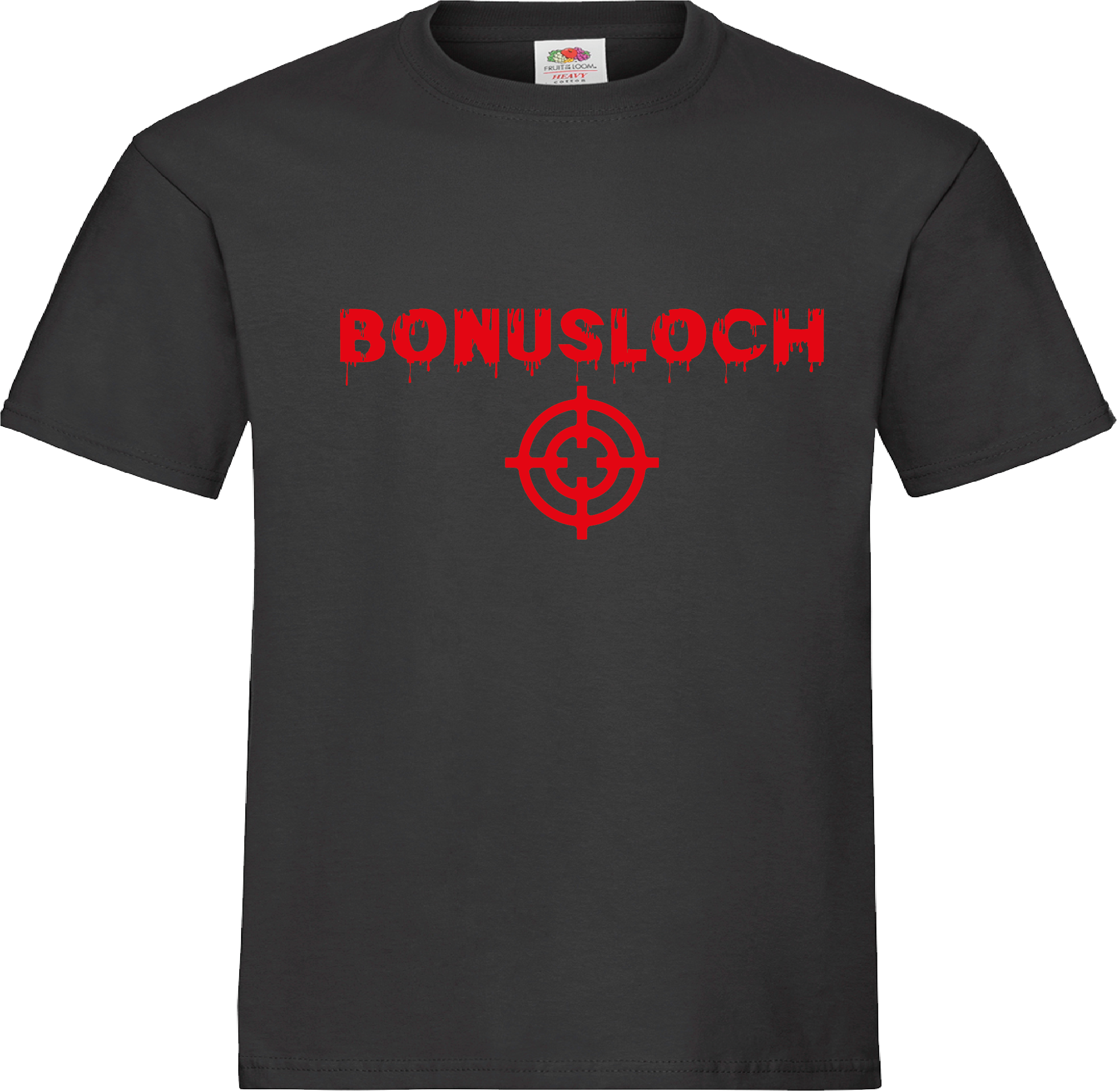 T-Shirt mit individuell in rot angefertigtem Aufdruck Bonusloch und Fadenkreuz