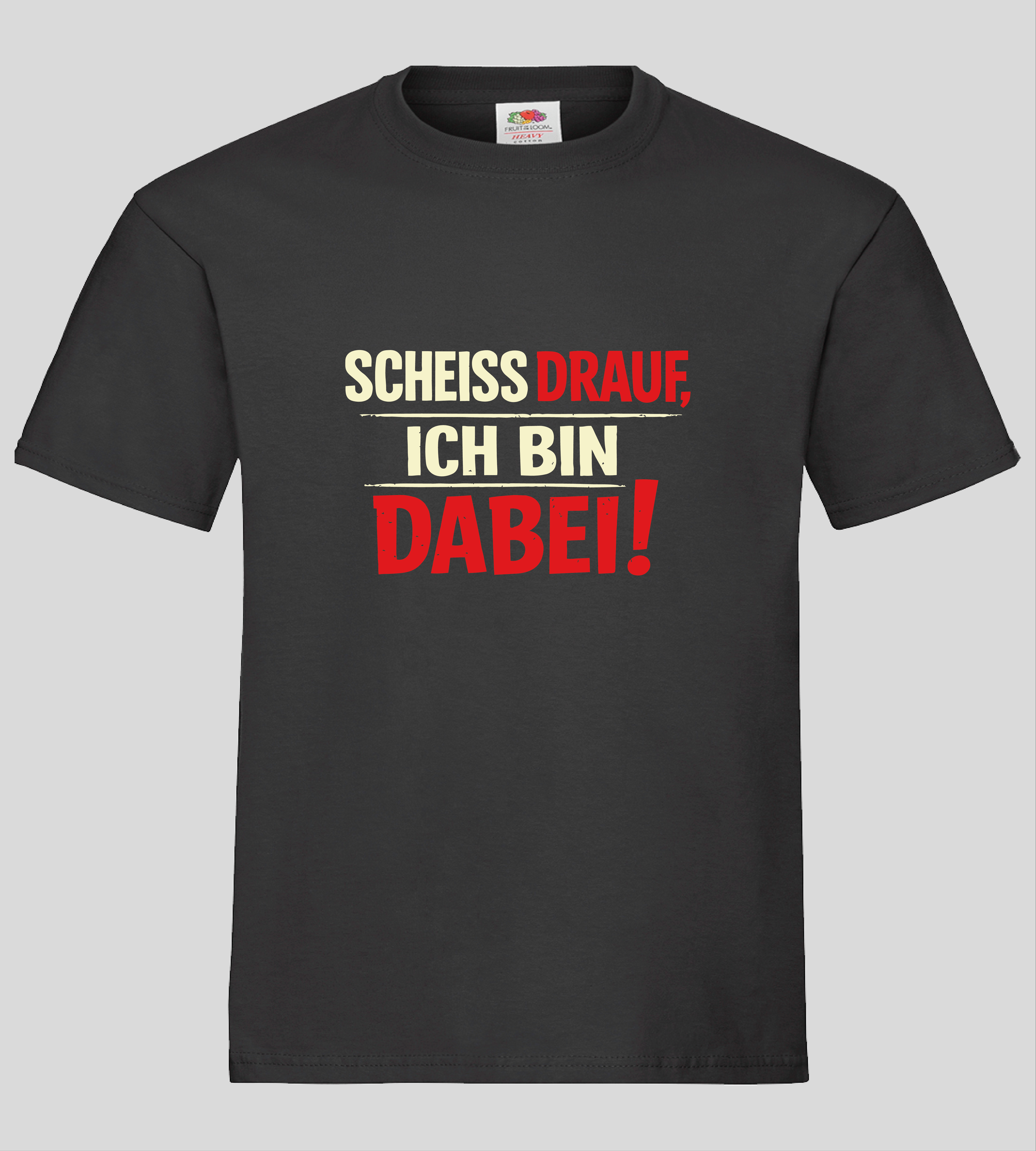 Schwarzes T-Shirt mit markantem SCHEISS DRAUF, ICH BIN DABEI! Print.