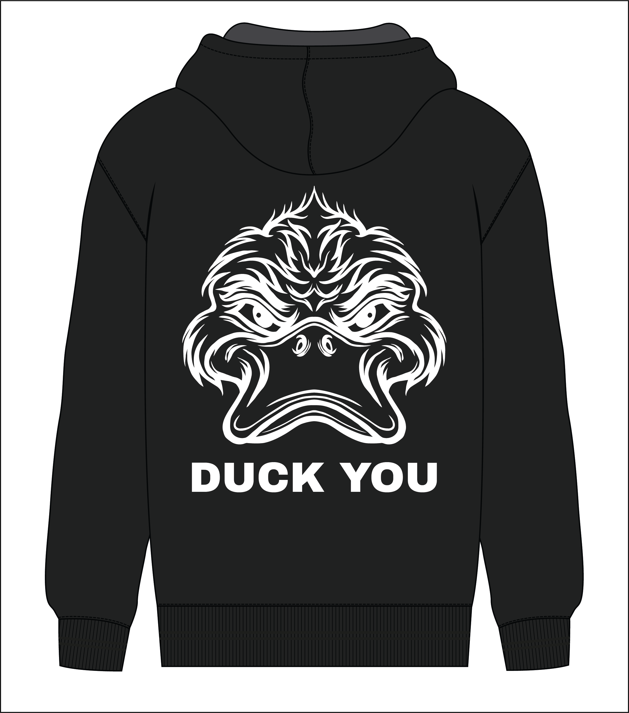 Hoodie mit individuell angefertigtem Aufdruck DUCK YOU auf dem Rücken.